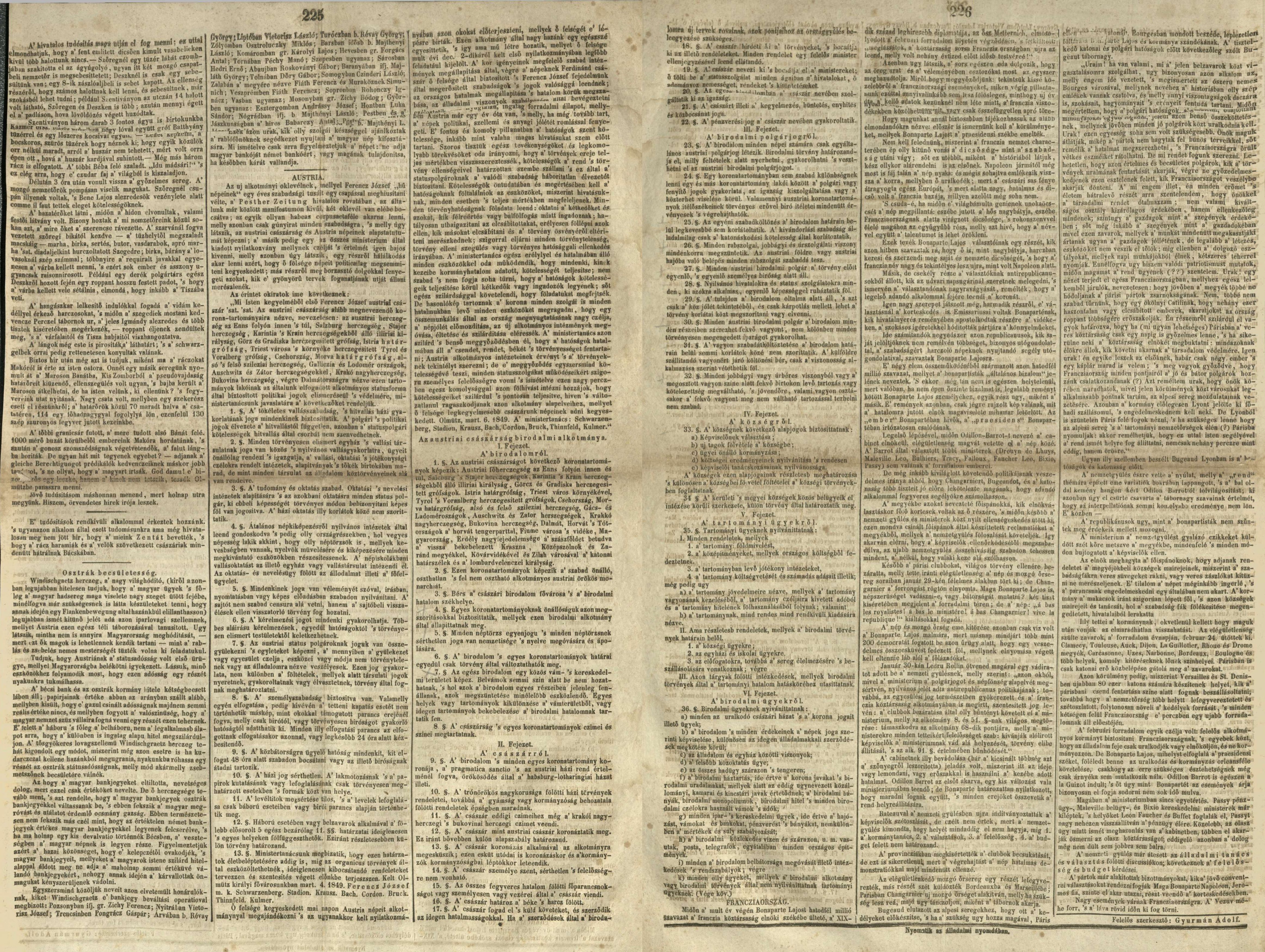 Magyarország alkotmánya olyképen tartatik fenn, hogy mindazon szabályai, melyek a birodalmi alkotmánnyal összhangzásban nincsenek, érvényöket vesztik; s hogy minden nemzetiség és divatozó nyelv egyenjogúsága a nyilvános és polgári élet összes viszonyaiban célszerü intézmények által biztosíttassék. (Olmützi alkotmány, 71. §)