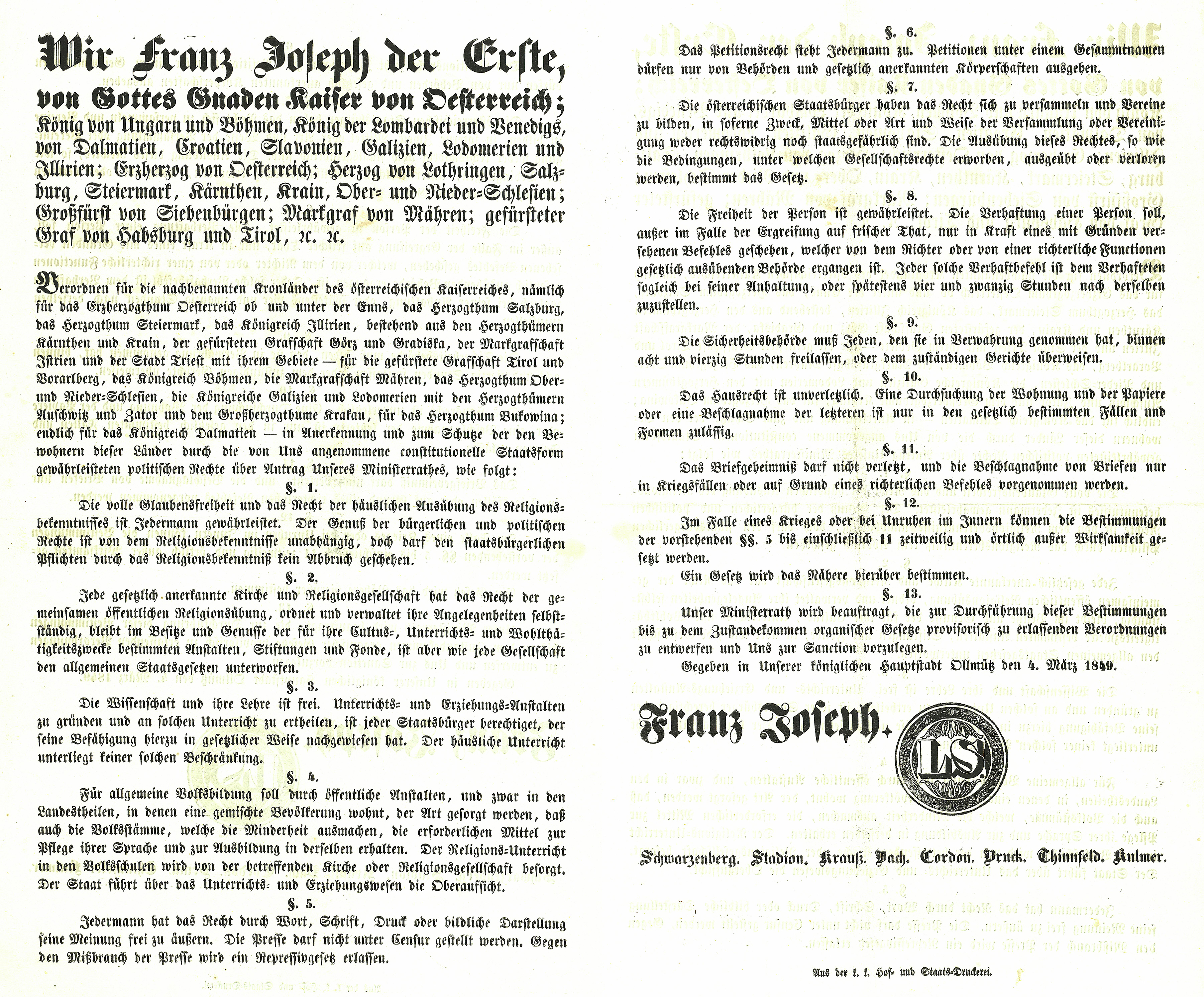 ​​​​​​Az alkotmány szerint az ausztriai császárság koronatartományokból áll, amelyek együtt „képezik a szabad, önálló, oszthatatlan és felbonthatatlan alkotmányos ausztriai örökös monarchiát”. Az alkotmány Magyarországról leválasztotta és külön tartománnyá nyilvánította Erdélyt a Részekkel, az egymással egyesítendő Horvátországot, Szlavóniát és a Tengermelléket; a Katonai Határőrvidéket; a Bácskából és a Temesközből szervezendő Szerb Vajdaságot. Az okmány az alapvető fontosságú ügyeket, így többek között a hadügyet, a pénzügyet, a külügyet, valamint az ipar- és kereskedelemügyet a majdan létrehozandó birodalmi gyűlés kezébe tette. Az egyes tartományok képviselőiből álló új Birodalmi Gyűlés a törvényhozó hatalmat a császárral együtt gyakorolhatta volna, a kormányzást viszont teljesen az uralkodó jogának nyilvánították.