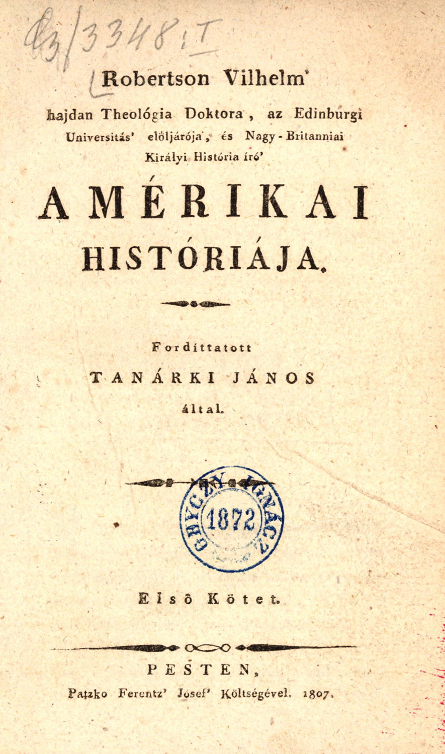 ​​​​​​Az imént bemutatott mű megtalálható az Országgyűlési Könyvtár Muzeális Gyűjteményében, mégpedig magyar fordításban, „Robertson Vilhelm’ amerikai históriája” címmel. A Ghyczy-hagyaték részeként került intézményünkbe, erről tanúskodik a címlapján található, kék tintával nyomott ex libris-pecsét is („Ghyczy Ignacz 1872”). A kétkötetes kiadás 1807-ben, illetve 1809-ben jelent meg Pesten, „Patzko Ferencz Jósef’ költségével”. Az eredeti angol szöveget egy bizonyos Tanárki János ültette át magyarra, aki sokoldalú ember lehetett: íróként, műfordítóként és orvosként is működött. A két kötet összesen bő másfélezer oldal hosszúságú és térképeket, illetve az egyes nagyobb tartalmi egységek elején és végén metszeteket is tartalmaz.