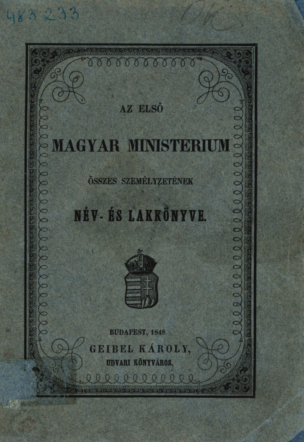 ![Kép 1. Az első magyar ministerium összes személyzetének név és lakkönyve. Pesten: Geibel Károly udvari könyvárusnál, 1848. [2], 79 p. Forrás: OGYK (483.233 MPGY-muzeális)](/documents/56469078/56470493/01-geibel-01.jpg/12091d95-26de-13b5-fbd7-3240e555135c?t=1655104148578)