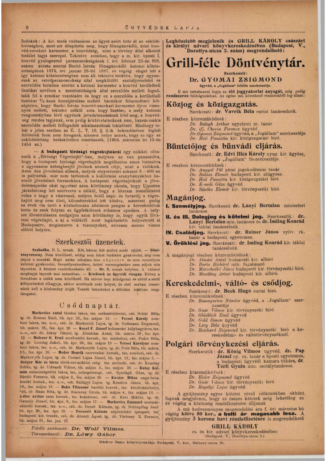 További jelentős kiadványuk volt a Grill-féle döntvénytár, illetve a Grill-féle új döntvénytár. A Grill-féle döntvénytár 19 kötete 1904 és 1913 között látott napvilágot, 1904-ig mindegyik kötet egy-egy jogág, illetve jogterület bírói gyakorlatát dolgozza fel. A Grill-féle döntvénytár a 11. kötettől (1904) évkönyvként jelent meg. Ekkortól az egyes kötetek az előző évre vonatkozó bírói gyakorlatot dolgozták fel. Az összeállítás folytatása volt a Grill-féle új döntvénytár, melynek kötetei 1927 és 1943 között láttak napvilágot.