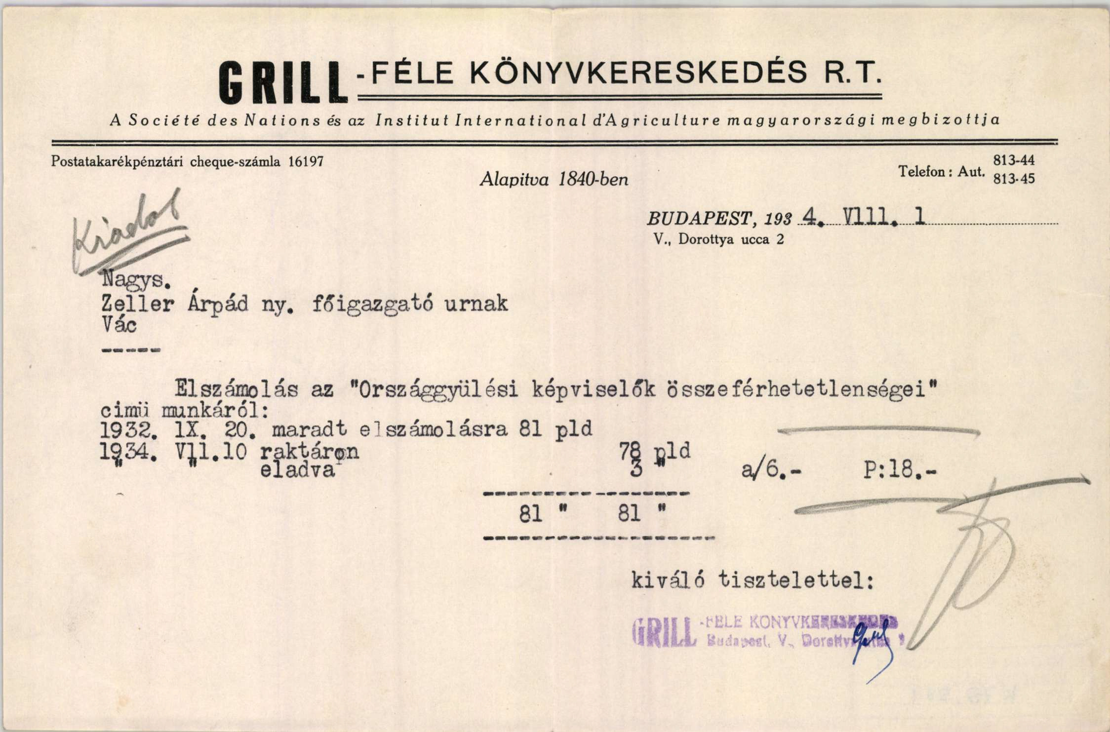 „ […] a Dorottya uccai bolthajtásos, zeg-zúgos régi bolt falai között már a modern élet üteme lüktet. Külföldi kapcsolatai révén irodalmi és tudományos szortimentje első helyen áll. Kiadványai régebben a jogi, újabban a politikai és gazdasági irodalom válogatott darabjai. Aktualitás, elevenség, friss ötletek, a közönséggel és az élettel való közvetlen kapcsolat adják meg a Grill-boltnak azt az egyéni jelleget, mely számára egészen speciális helyet biztosít a mai Pest könyvéletében.”