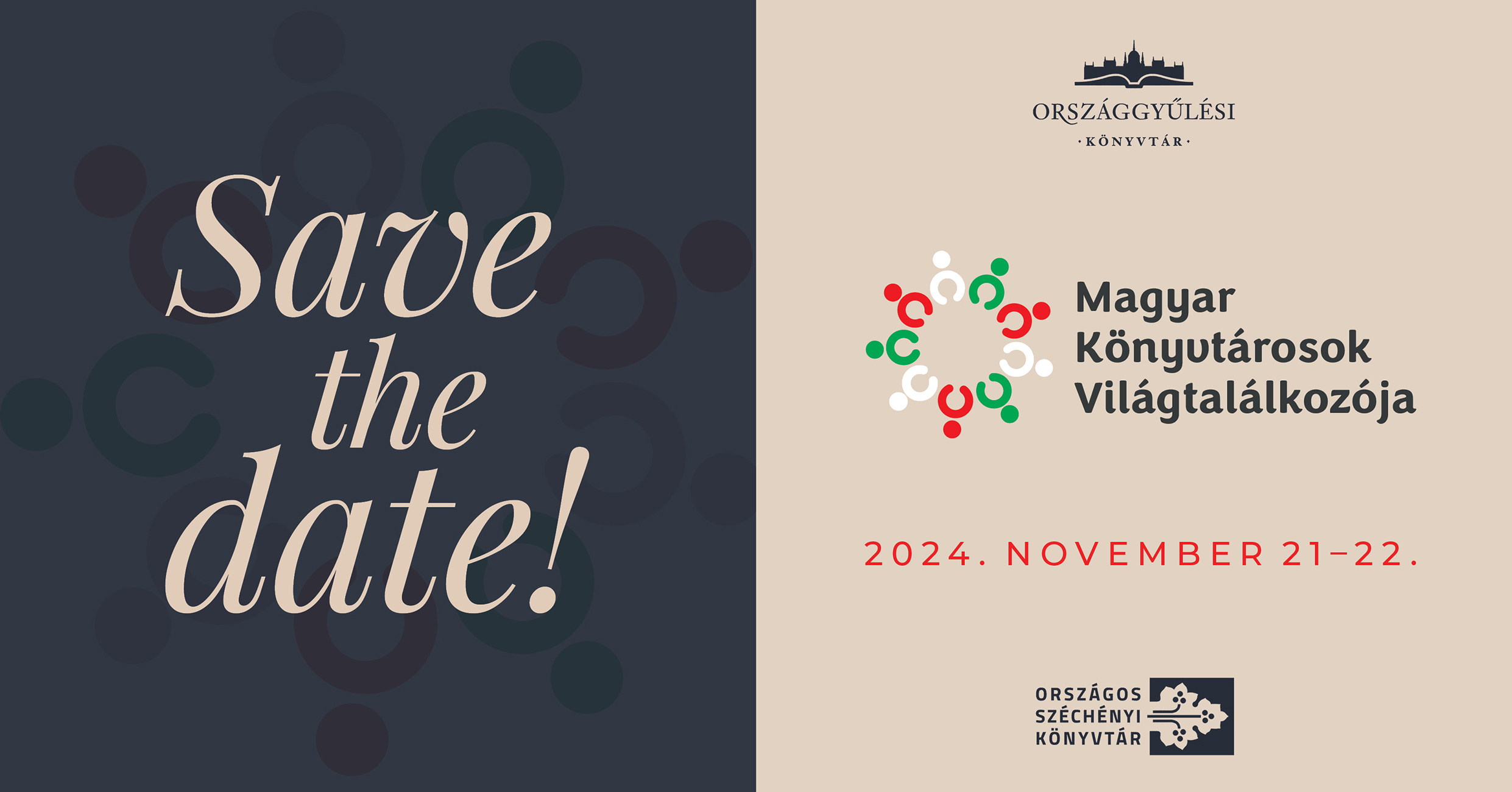 Az Országgyűlési Könyvtár és az Országos Széchényi Könyvtár közös szervezésében 2024. november 21-én és 22-én megrendezésre kerül a Magyar Könyvtárosok IX. Világtalálkozója. A konferencia első napjának a helyszíne az Országház, a másodiké pedig az Országos Széchényi Könyvtár lesz. További részletek hamarosan.