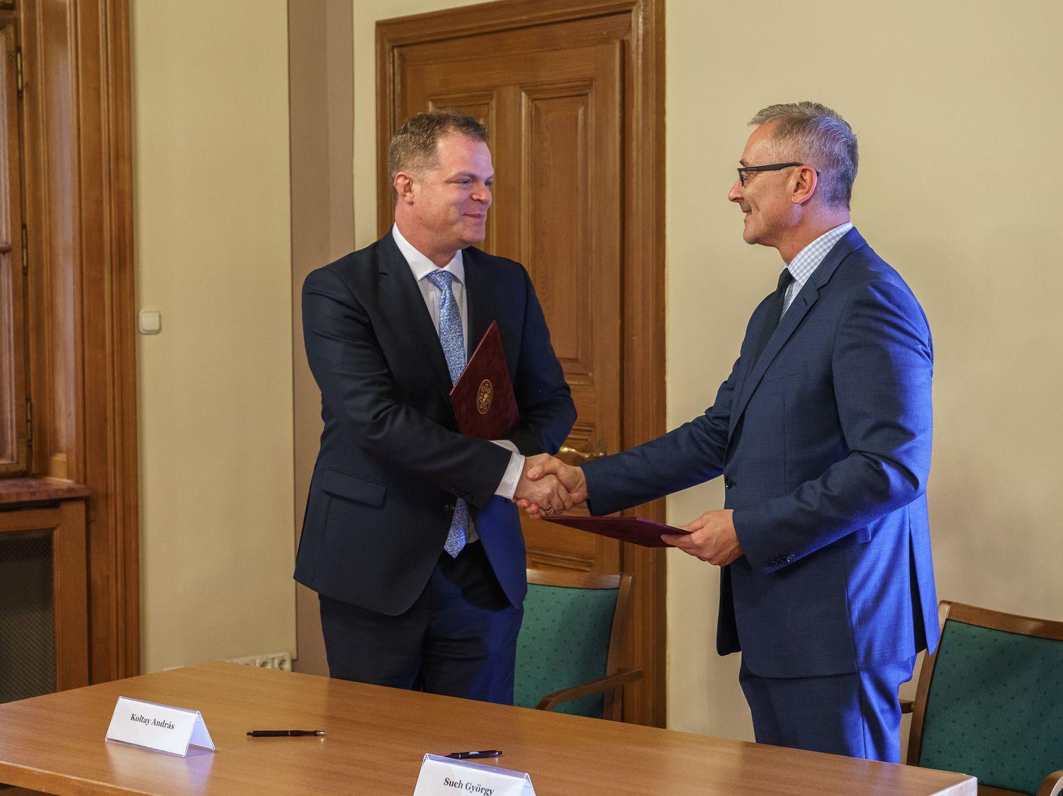 Koltay András (balra) és Such György a megállapodás aláírását követően kezet fog (© Bencze-Kovács György)