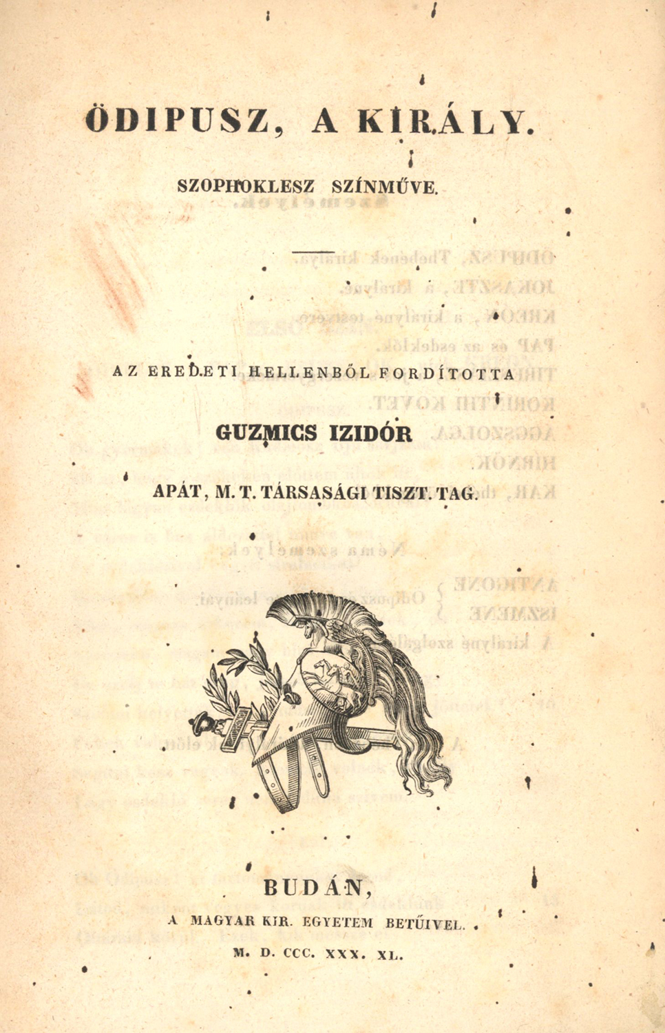 Ödipusz, a király. Buda] Budán: A Magyar Királyi Egyetem betűivel, 1840. OGYK-jelzet: A3/623:1