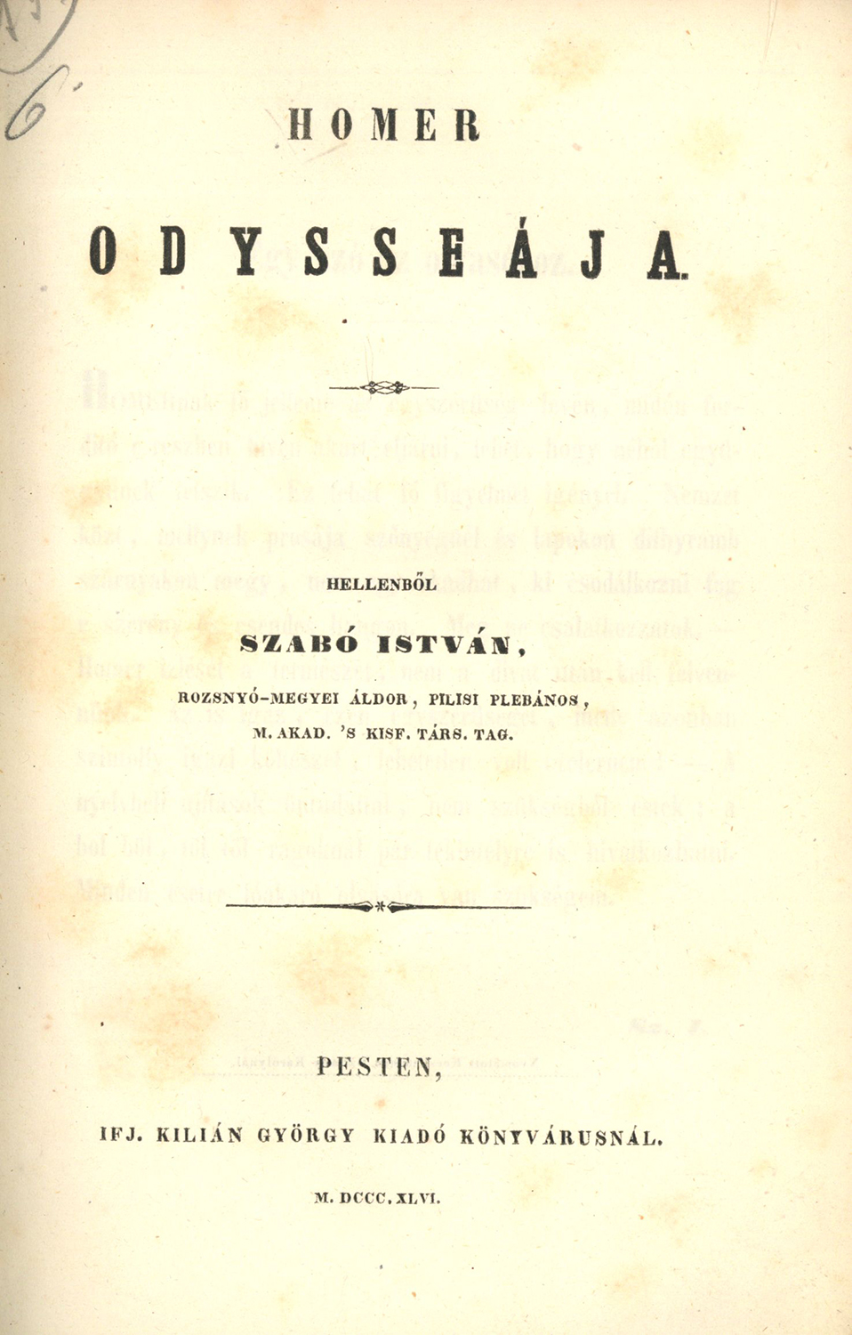 Homérosz: Homeros Odysseája [Pest] Pesten: Ifj. Kilián György Kiadó Könyvárusnál, 1846. OGYK-jelzet: A3/623:2