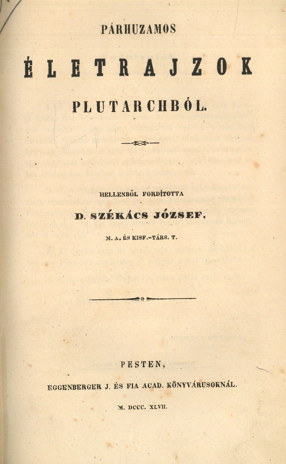 Párhuzamos életrajzok Plutarchból. Pest] Pesten: Eggenberger J. és fia Acad. Könyvárusoknál, 1847. OGYK-jelzet: A3/623:3