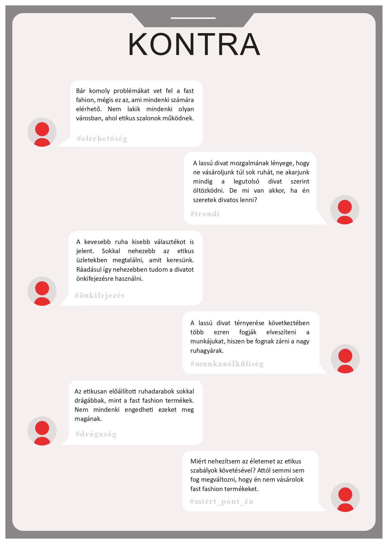 Pro és kontra érveket tartalmazó tablók A tablók az álláspontok kialakításában nyújtanak segítséget: a mellett és az ellen sorakoztatnak fel érveket, hogy szükséges-e változtatni a vásárlási szokásainkon vagy sem. Letöltésükhöz kattintson a képekre! |